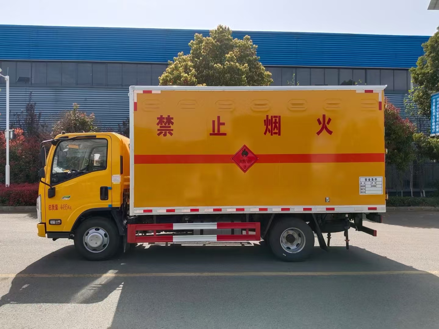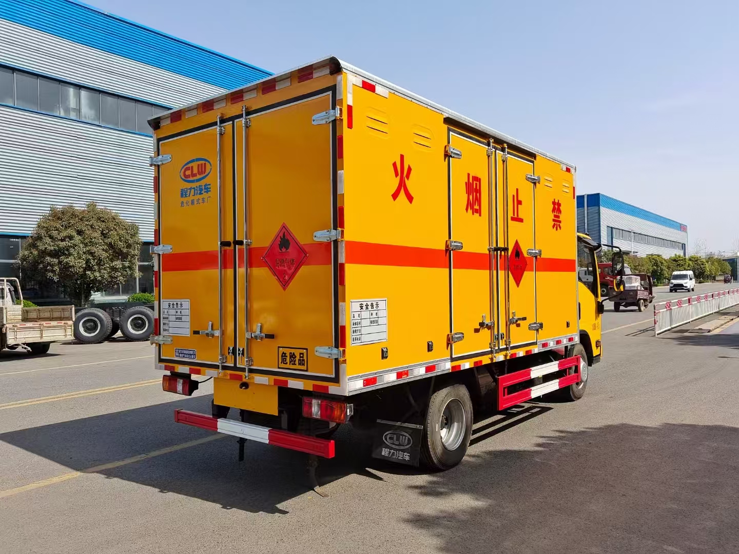 | 貨箱配置 | 廂體為雙層金屬骨架結(jié)構(gòu),外板采用冷軋鋼板,中間填充阻燃泡沫,內(nèi)飾為鋁板。底板為平板上鋪防靜電膠皮。廂內(nèi)兩側(cè)加裝固定貨物臥環(huán),門框帶防盜報(bào)警器,頂部帶煙霧報(bào)警器,廂體右側(cè)選裝側(cè)門,隨車配2個滅火器,危險(xiǎn)標(biāo)志牌,防火帽,危險(xiǎn)品三角頂燈。 (選裝瓦楞板貨箱) (尾部可選裝液壓升降尾板) | ||