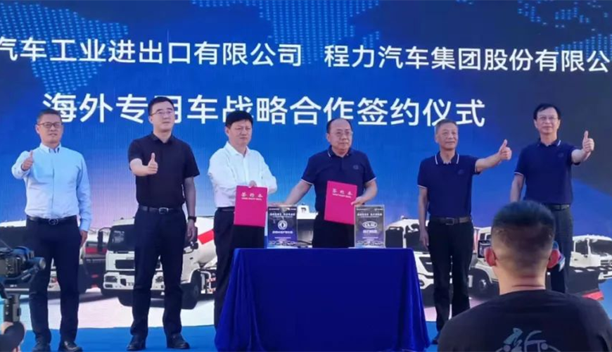 在這次線下大型東風商用車海外市場新產品推薦會上,中國東風汽車工業(yè)進出口有限公司與程力汽車集團股份有限公司聯合舉行了海外專用車戰(zhàn)略合作簽約儀式,雙方高層領導簽約后合影紀念。